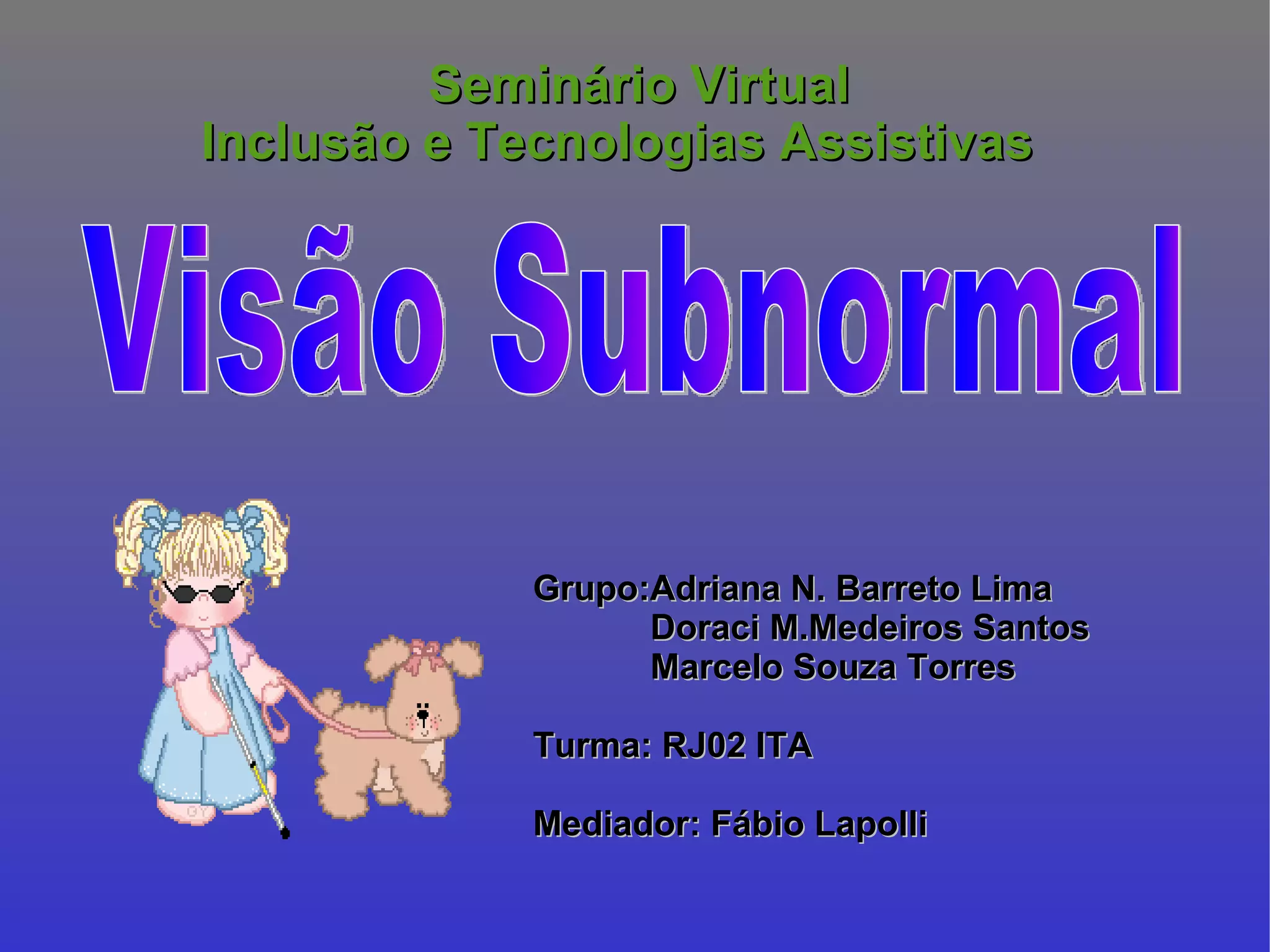 O documento discute visão subnormal ou baixa visão, definindo-a como um comprometimento da função visual que impossibilita uma visão útil. Detalha sinais de baixa visão em crianças e recursos como óculos, lupas e iluminação que podem melhorar a visão. Também apresenta o sistema DOSVOX, que permite que pessoas com deficiência visual utilizem computadores de forma independente.