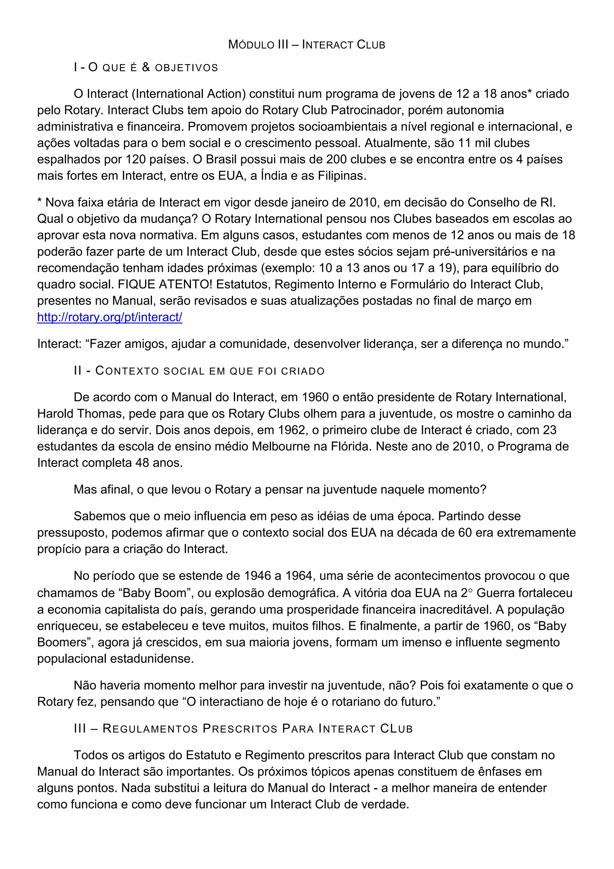 O documento descreve o programa Interact, criado pelo Rotary International em 1962 para jovens de 12 a 18 anos. O Interact promove projetos sociais e de liderança a nível local e global. Os clubes Interact devem seguir regulamentos do Rotary, incluindo ter um Clube Patrocinador e realizar projetos internacionais e de serviço comunitário anualmente.