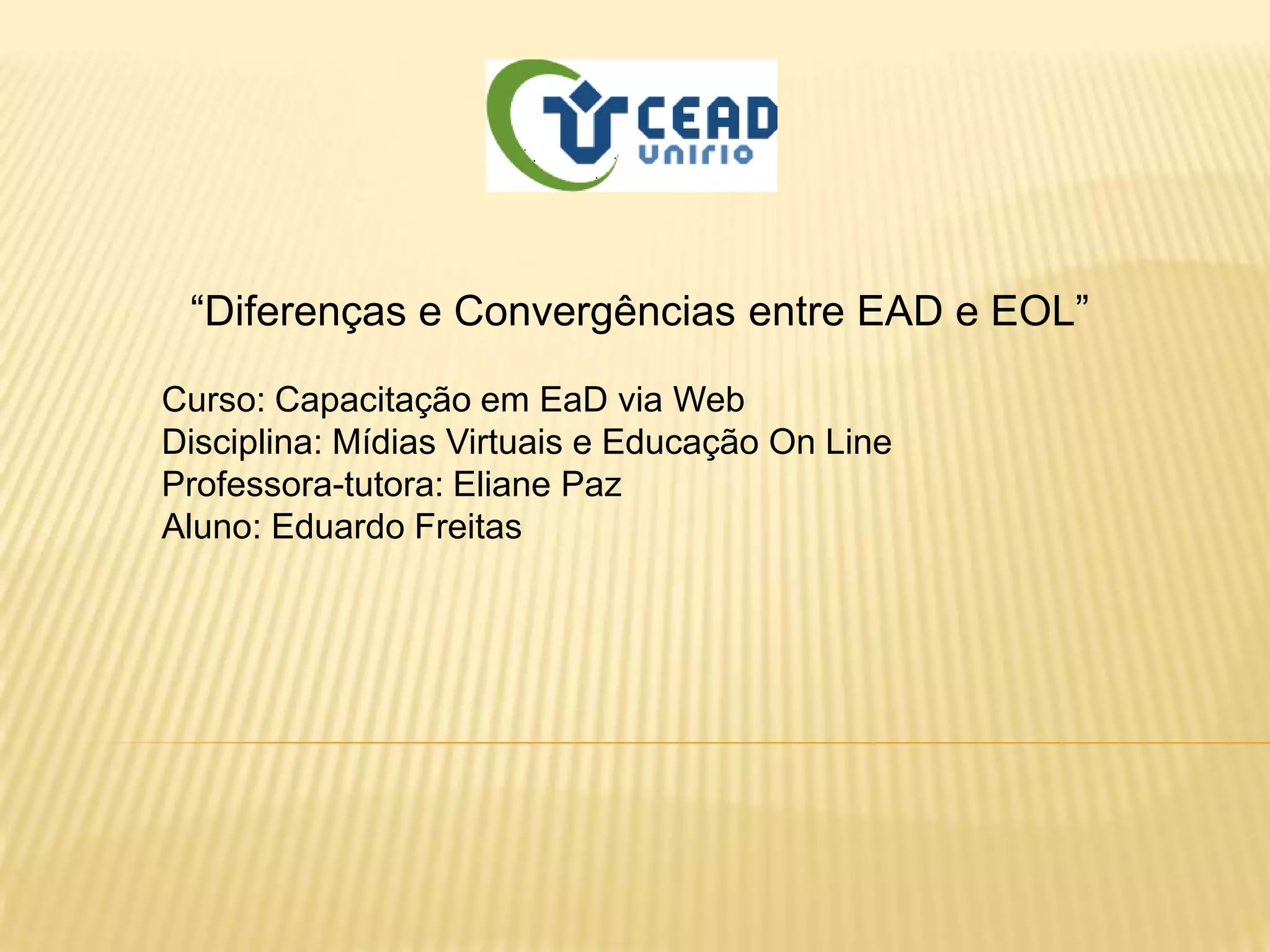 O documento discute as diferenças e convergências entre Educação a Distância (EaD) e Educação Online (EOL), definindo EaD como podendo usar diferentes meios como correspondência ou internet, enquanto EOL é realizada exclusivamente via internet, necessitando de Ambiente Virtual de Aprendizagem. Apresenta também as convergências como incentivo à comunicação em grupo e sistemas de tutoria.