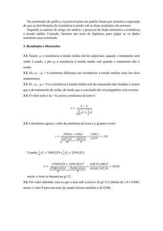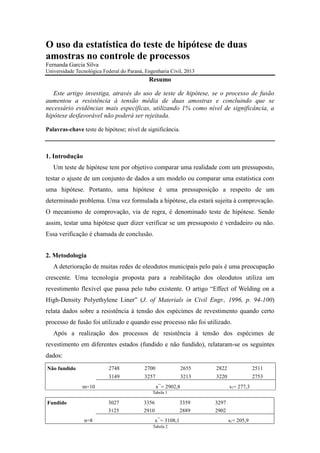 Este documento descreve um estudo que usou um teste de hipótese para determinar se um processo de fusão aumentou a resistência à tensão média de amostras. Os resultados mostraram que a resistência à tensão média das amostras fundidas foi maior do que as não fundidas, confirmando a conclusão do estudo original com um nível de significância de 5%. No entanto, com um nível de 1%, a hipótese nula de que não houve diferença não poderia ser rejeitada.