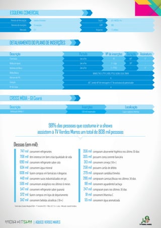 O documento descreve um plano de marketing para o programa "Aquece Verdes Mares" que promove os blocos de pré-carnaval em Fortaleza. O plano inclui anúncios de TV e online para divulgar os blocos e votações populares, com o objetivo de atrair patrocinadores para o programa.