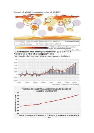 Este documento discute o aquecimento global, incluindo suas causas principais como a emissão de gases de efeito estufa, suas consequências como o aumento do nível do mar, e medidas que podem ser tomadas para preveni-lo, como uso de energia renovável e reciclagem.