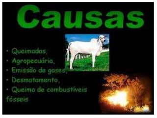 O documento discute o aquecimento global, incluindo suas causas como emissão de gases de efeito estufa por atividades humanas, e suas consequências como degelo e mudanças climáticas. A temperatura global vem aumentando desde meados do século 19 devido a fatores naturais e atividades humanas que intensificam o efeito estufa.