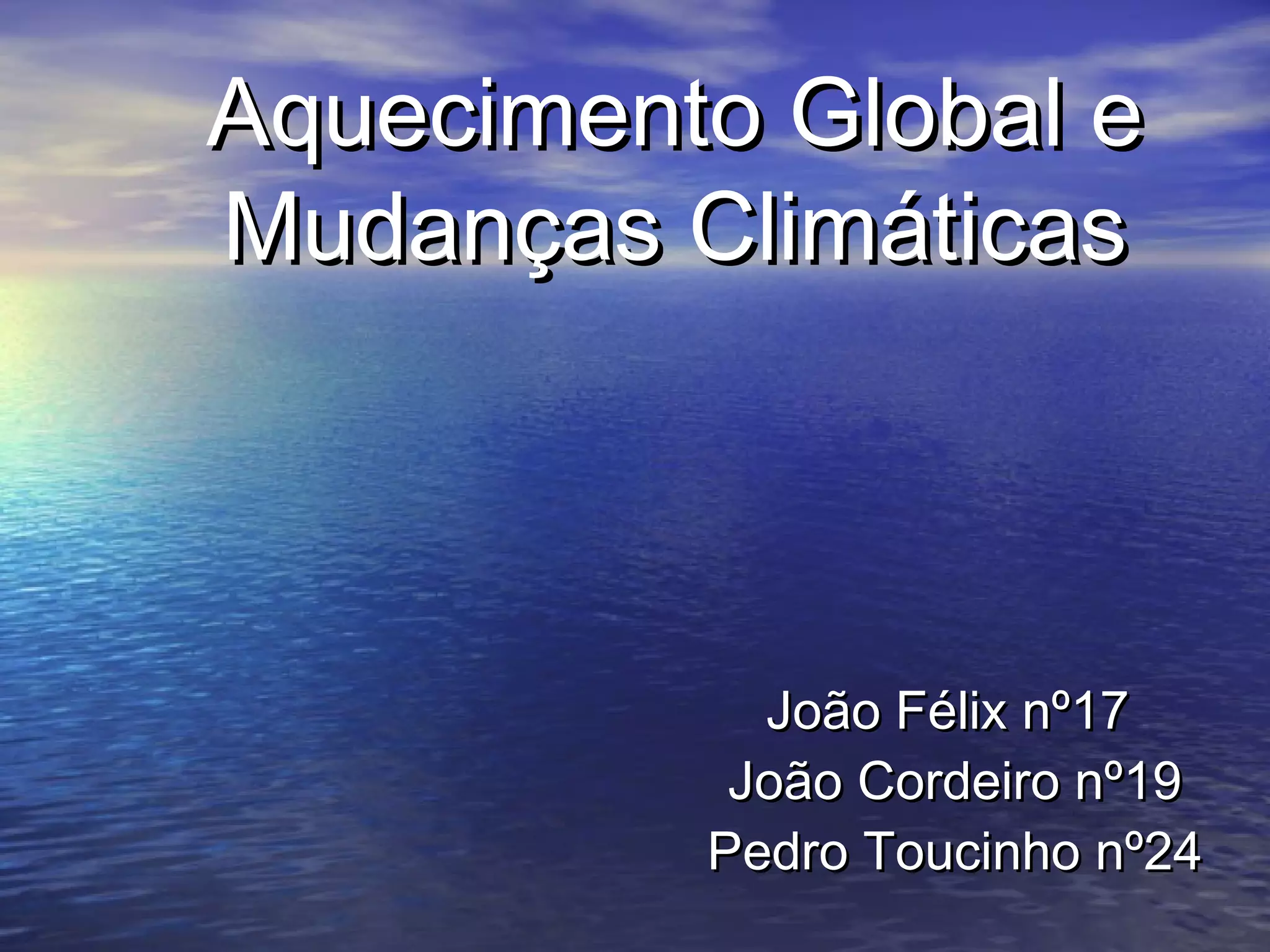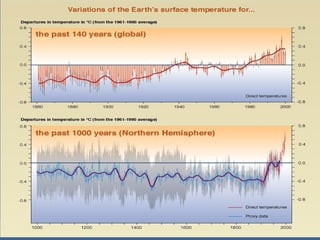 O documento discute o aquecimento global e as mudanças climáticas, definindo o efeito estufa, aquecimento global e mudanças climáticas. Aponta que a temperatura global aumentou 0,6°C no século XX e deve subir mais 3°C até 2100, com aumento dos níveis de CO2 na atmosfera desde a Revolução Industrial prejudicando o clima. Detalha evidências e consequências destas mudanças, como aumento do nível do mar e ameaças à saúde, agricultura e biodiversidade.
