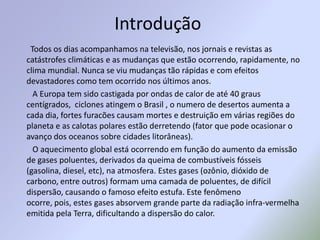 O documento discute o aquecimento global e as mudanças climáticas, incluindo suas causas como a emissão de gases do efeito estufa e desmatamento, e suas consequências como o aumento do nível do mar, desertificação e eventos climáticos extremos. A Conferência de Copenhague sobre o clima em 2009 teve resultados limitados para lidar com o problema. Indivíduos podem fazer sua parte para reduzir as emissões.