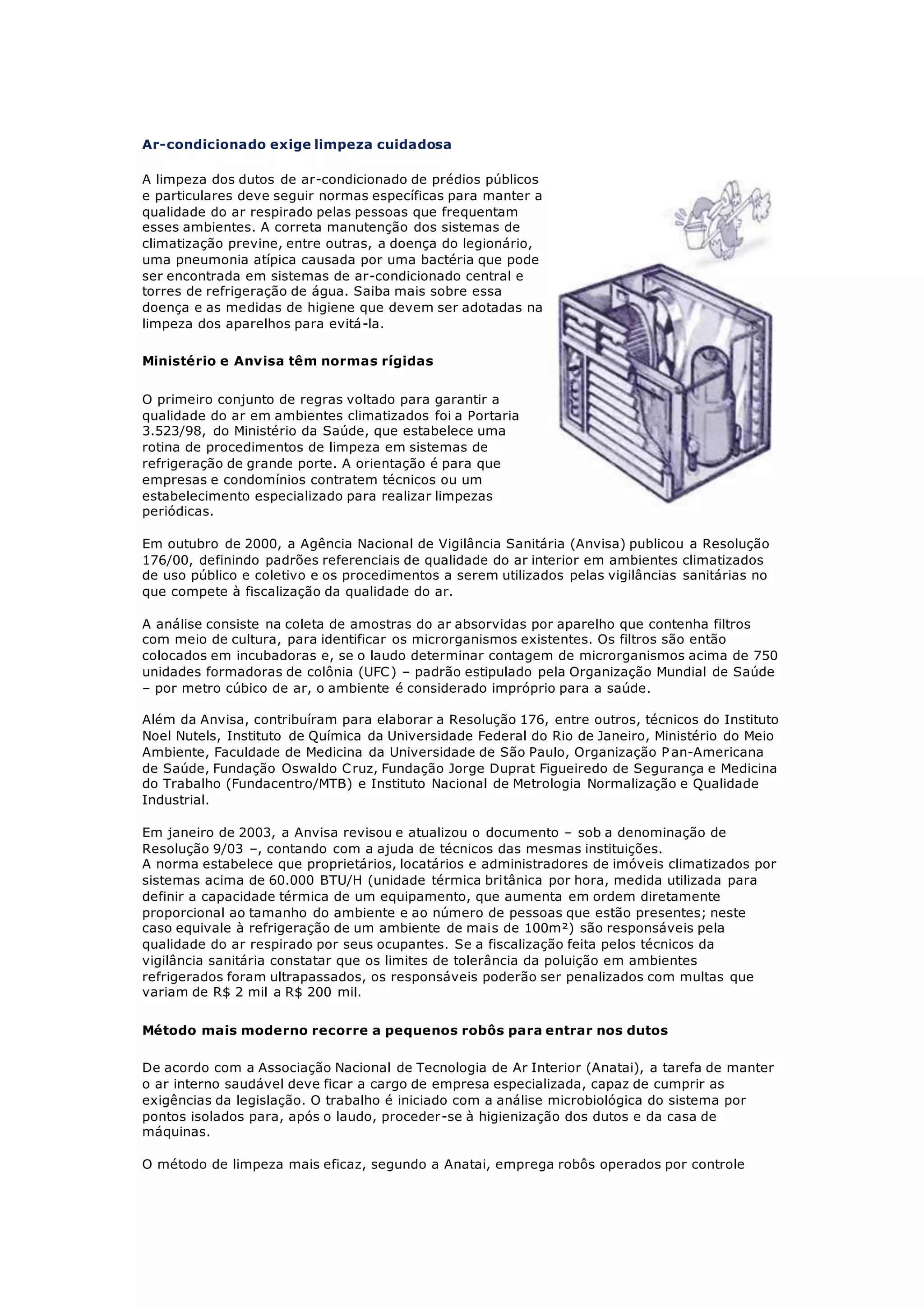 O documento discute a importância da limpeza correta de sistemas de ar-condicionado para prevenir doenças, como a doença do legionário. Existe legislação do Ministério da Saúde e Anvisa que estabelece normas para a limpeza periódica utilizando métodos especializados para garantir a qualidade do ar.