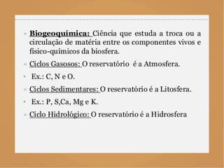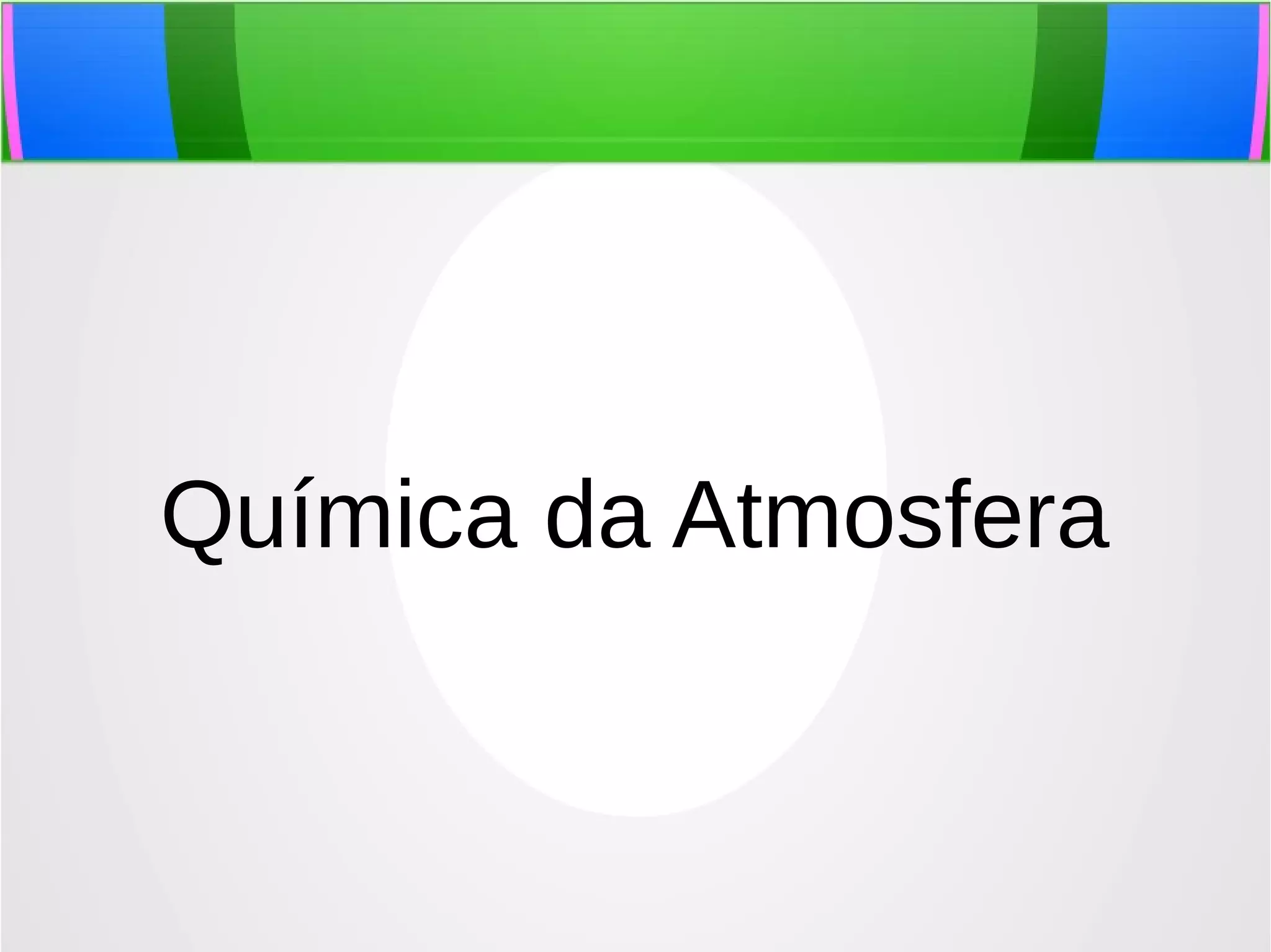 O documento descreve a atmosfera terrestre, incluindo sua composição atual de gases e partículas, além de fontes e sorvedouros de compostos. Apresenta também conceitos como reações químicas atmosféricas, tempo de residência de gases, ciclos biogeoquímicos do carbono, nitrogênio e enxofre, e o efeito estufa.