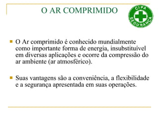 O documento discute os perigos do uso de ar comprimido, incluindo contaminantes como óleo, poeira e gases que podem causar danos à saúde. O ar comprimido não deve ser usado diretamente no corpo humano, pois pode romper tímpanos, causar hemorragias internas, descolar a retina e inflamar tecidos. Se o ar penetrar nos tecidos, pode causar embolia gasosa, que interrompe a circulação sanguínea e pode ser fatal.