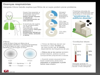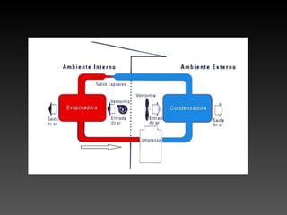 O documento discute a história do ar condicionado, desde sua invenção por Willis Carrier em 1902 até as tecnologias modernas. Aborda como o ar condicionado funciona absorvendo energia de um local e liberando em outro através do ciclo do refrigerante. Também menciona os riscos à saúde de sistemas antigos que usavam gases inflamáveis e como novas tecnologias produzem mais calor/frio com menos energia.