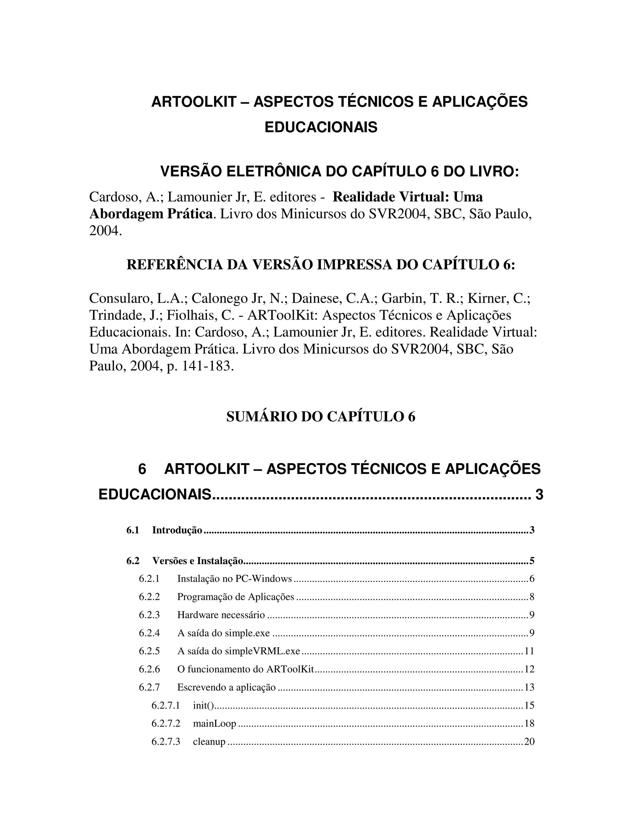 3. O documento descreve procedimentos como calibração de câmeras e programação básica de aplicações com ARToolKit, além de discutir limitações e aplicações educacionais de Realidade Aumentada.