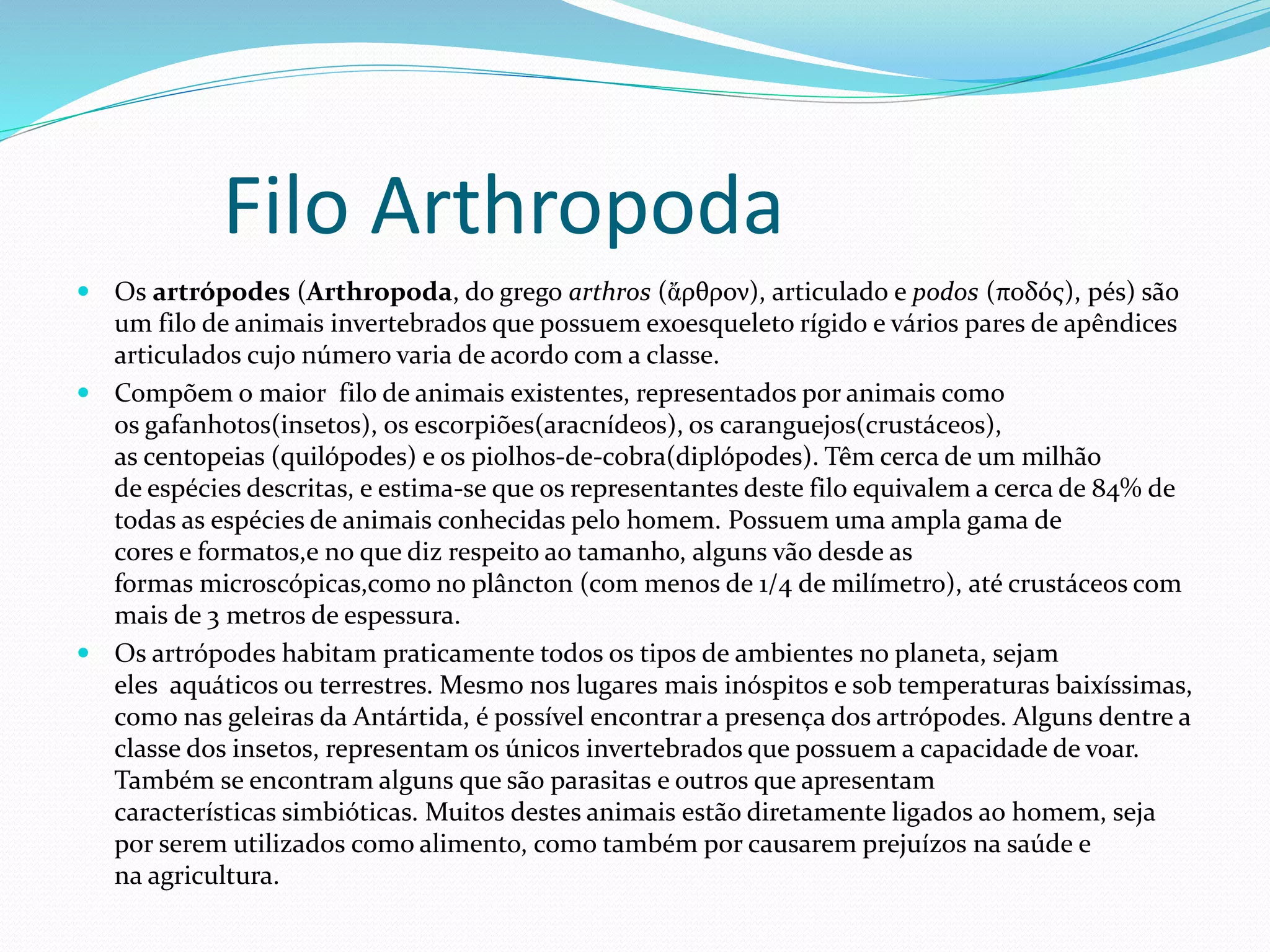 Os artrópodes são um grande filo de animais invertebrados que incluem insetos, aranhas, caranguejos e outros. Eles têm exoesqueleto rígido e apêndices articulados e representam cerca de 84% de todas as espécies animais. Os aracnídeos como aranhas e escorpiões fazem parte deste filo e muitos habitam a terra, onde alguns usam veneno para caçar presas.