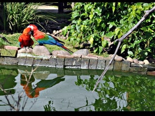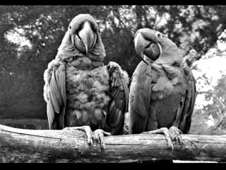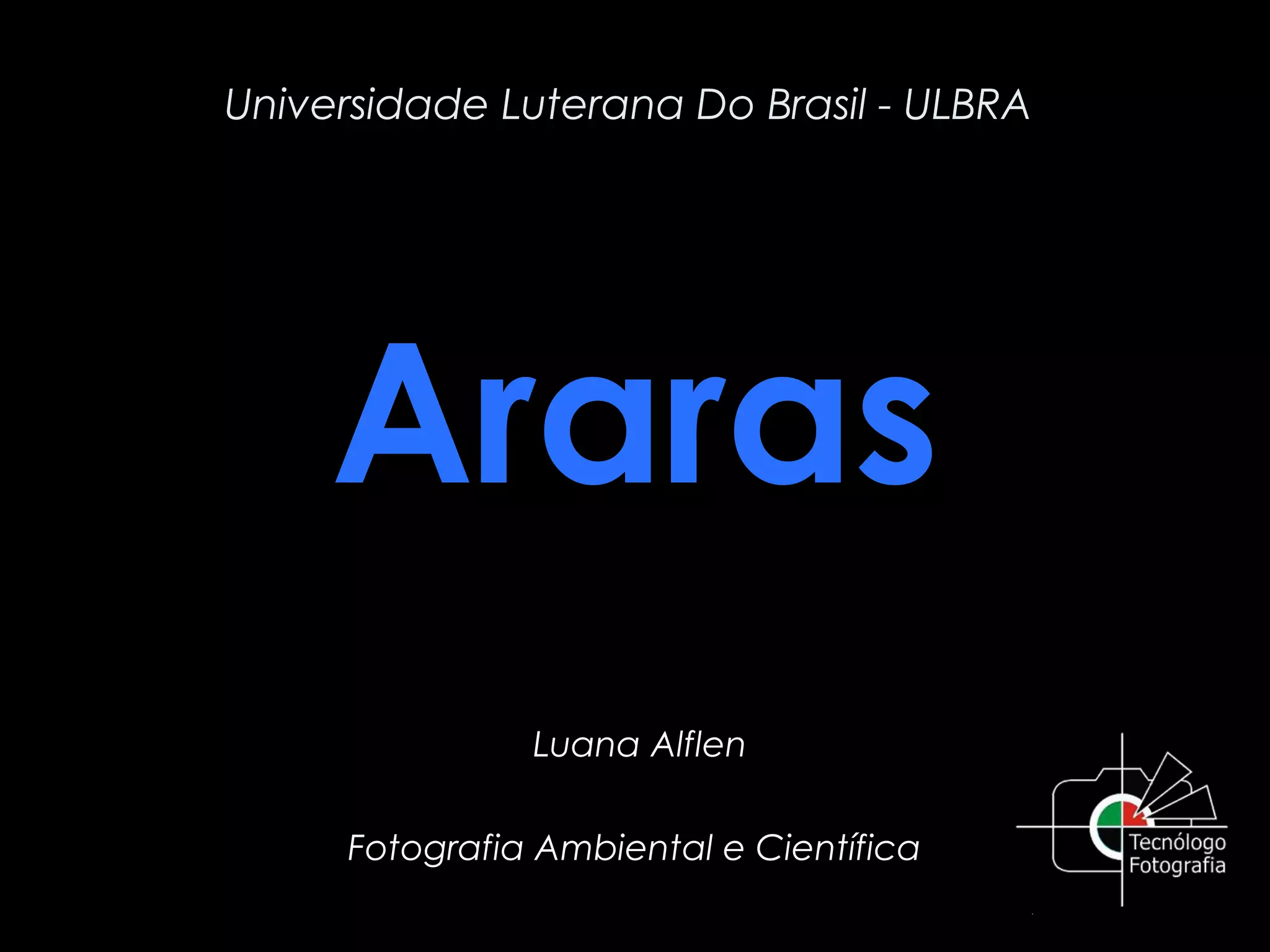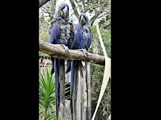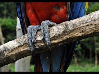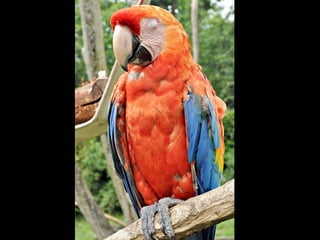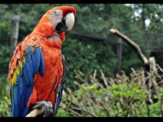 O documento descreve as araras, incluindo sua classificação biológica, hábitos alimentares, ninhos, habitat e espécies principais encontradas no Brasil. Muitas espécies de araras estão em risco de extinção devido à captura para servir como animais de estimação. Araras se comunicam gritando alto e se alimentam principalmente de frutas, sementes e insetos.