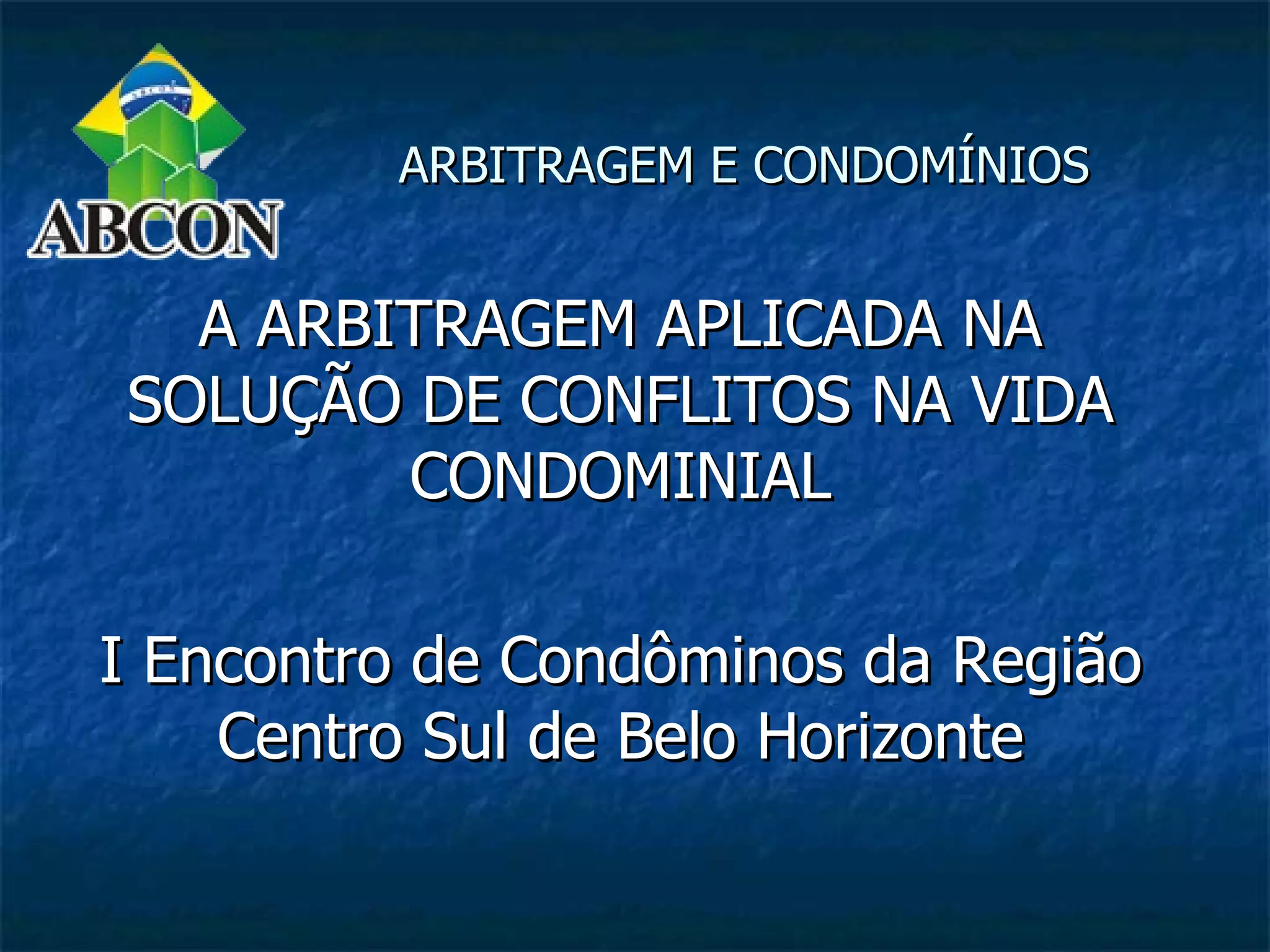 O documento discute a aplicação da arbitragem para resolver conflitos em condomínios de forma mais rápida e econômica do que processos judiciais. A arbitragem permite que as partes envolvidas em um conflito escolham um árbitro especializado para tomar uma decisão vinculante sem recurso legal. O uso da arbitragem tem crescido para resolver disputas cotidianas em condomínios.