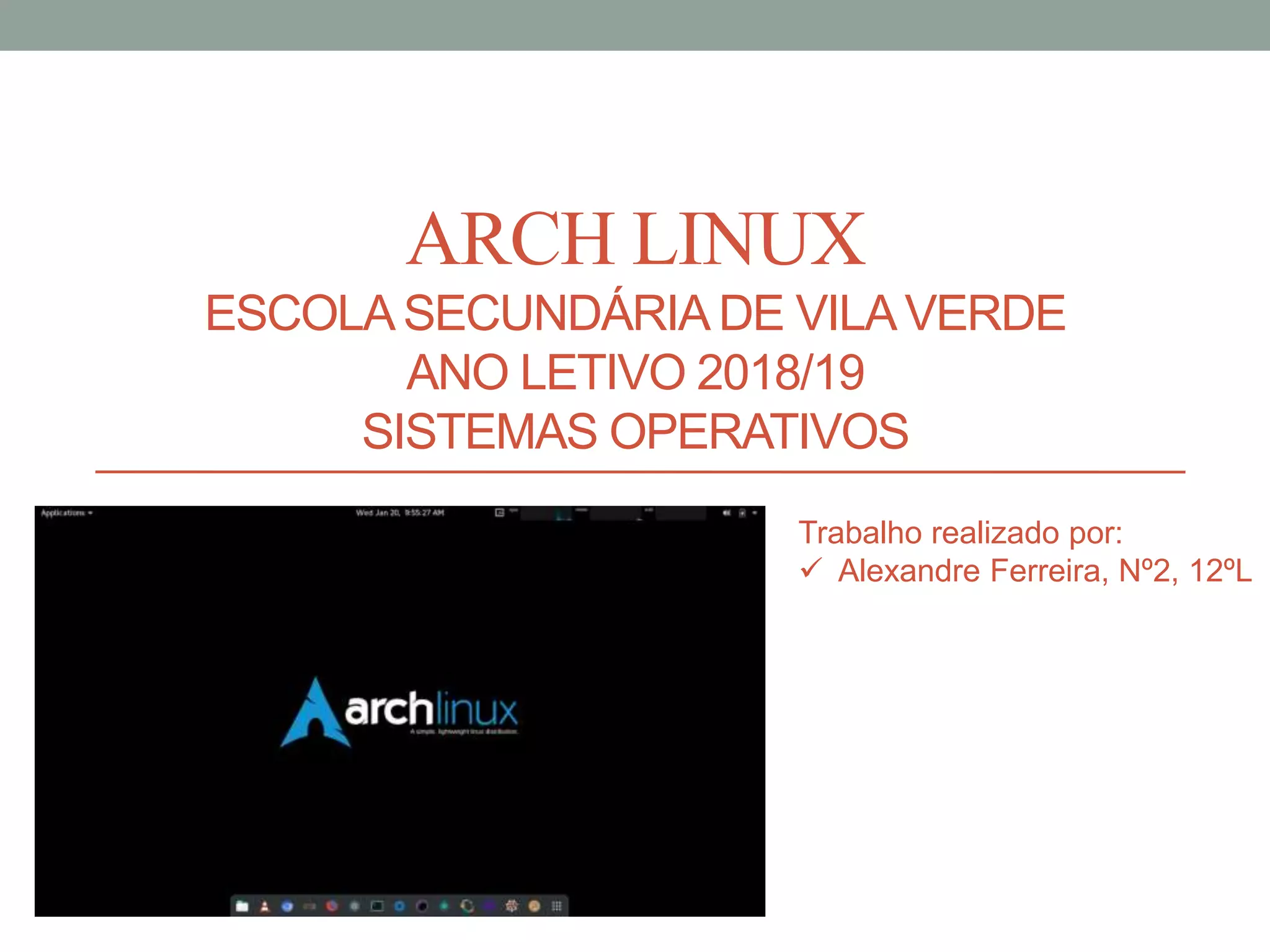 O documento descreve o sistema operativo Arch Linux, incluindo sua história, filosofia, gestor de pacotes Pacman, versões em rolling release e repositório comunitário AUR. Aborda também dez comandos Linux como cd, rm, ls, pwd, passwd, chown, man, mkdir, mv e date.