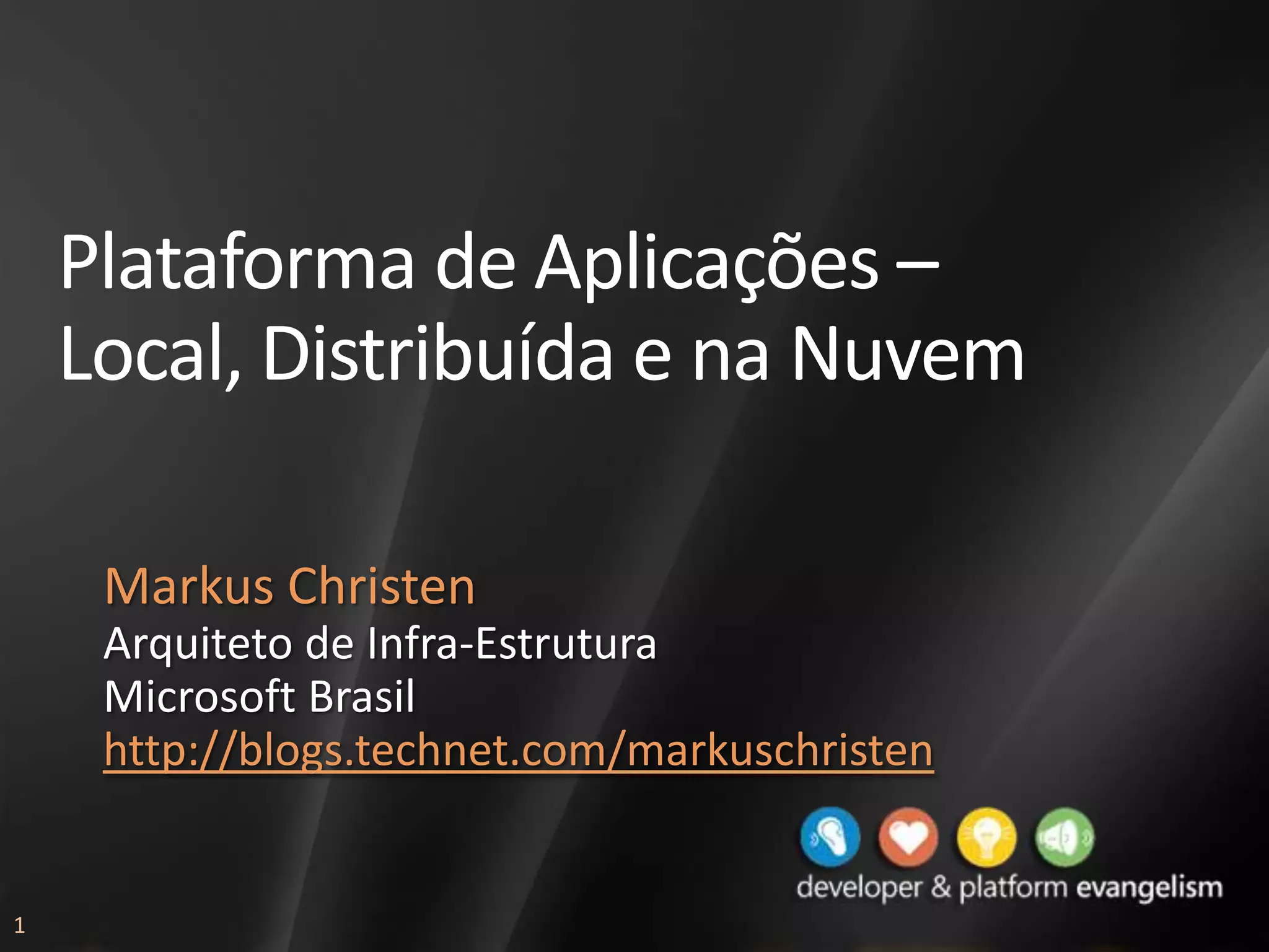 O documento discute a evolução e arquitetura das plataformas de aplicações, desde sistemas centralizados até a nuvem. Apresenta como as plataformas apoiam a estratégia de negócios ao permitir o desenvolvimento rápido de aplicações customizadas. Descreve os principais componentes de uma plataforma, incluindo desenvolvimento, integração, processos e infraestrutura.