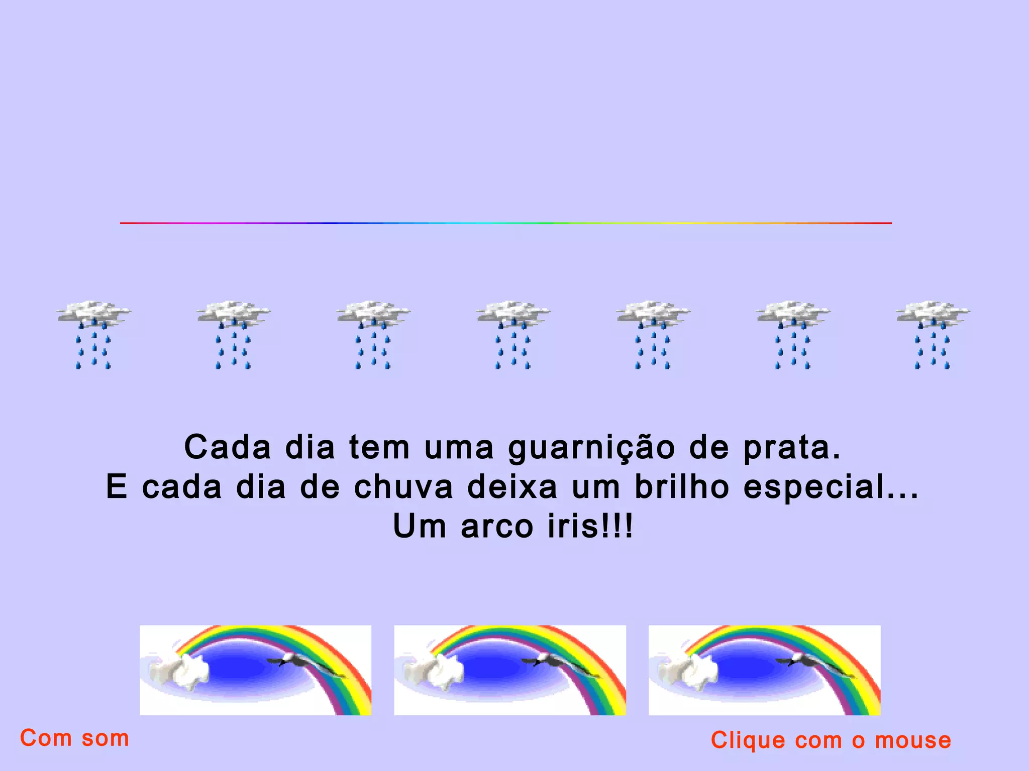 O documento fala sobre as cores do arco-íris e seus significados, como amor, natureza e esperança. Também reflete sobre como a chuva traz arco-íris e alegria aos corações, e deseja um dia colorido para o leitor.