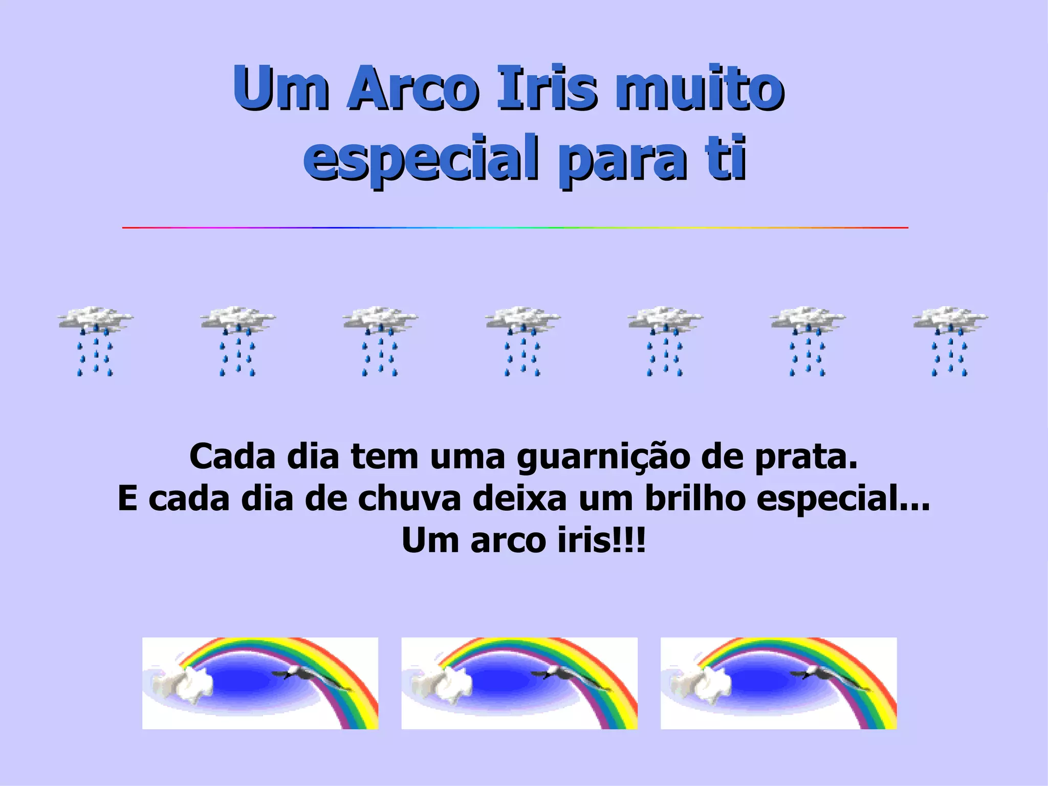 O documento fala sobre as cores do arco-íris e seus significados simbólicos. O vermelho representa o amor, o laranja a abundância, o amarelo a felicidade, o verde a natureza, o azul a vida, o indigo os sonhos e o violeta a paz. Também diz que para ver um arco-íris é preciso tolerar a chuva e que o maior arco-íris está no coração após a dor.