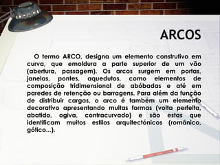 O documento descreve os diferentes tipos de arcos utilizados na arquitetura, incluindo o arco de volta perfeita usado na arquitetura romana, o arco ogival da arquitetura gótica, e outros como o arco contracurvado. Fornece exemplos de cada tipo de arco em monumentos e edifícios portugueses e estrangeiros.
