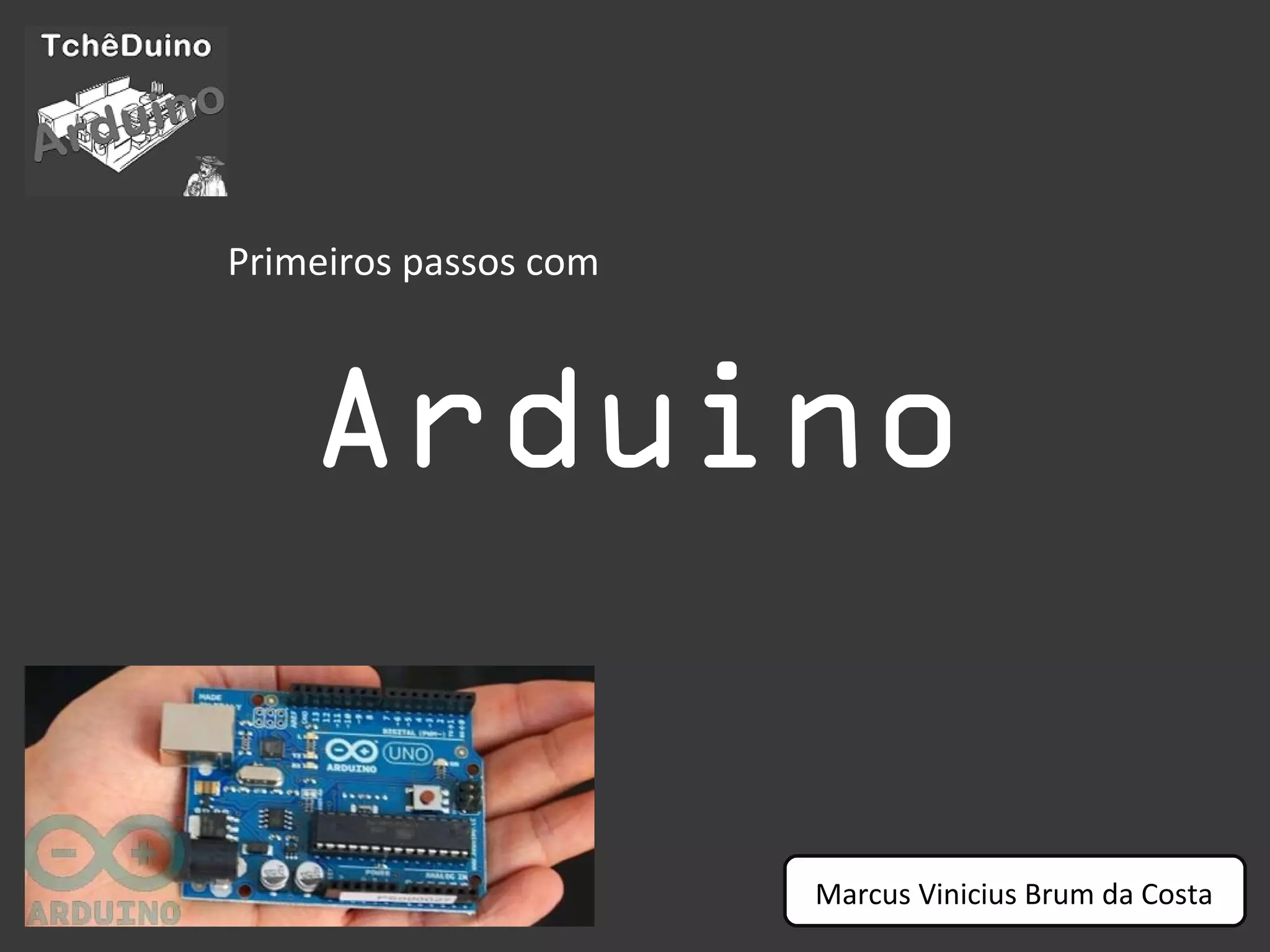 Este documento fornece uma introdução à plataforma Arduino, incluindo seu hardware e software. O Arduino pode ler sensores, controlar dispositivos e executar códigos de programação. Sua IDE gratuita torna a plataforma acessível para iniciantes em programação de hardware. O documento também fornece exemplos básicos de códigos para piscar LEDs, ler botões e controlar servomotores.