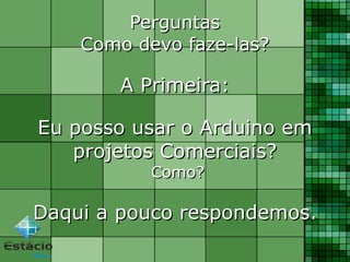 O documento discute conceitos e aplicações do Arduino, com foco na arquitetura ARM. Apresenta perguntas sobre uso comercial do Arduino e respostas. A programação inclui introdução ao palestrante e temas como linguagem de programação, microcontroladores, modelos de Arduino, arquitetura ARM e como começar.