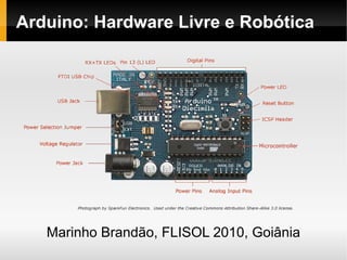 O documento apresenta o Arduino, uma placa de hardware livre para robótica e automação. O palestrante discute o que é o Arduino, exemplos de outros hardwares livres, como programar o Arduino usando a IDE, e exemplos básicos de projetos como acender LEDs e usar sensores. O documento fornece também dicas e referências para iniciantes interessados em aprender sobre Arduino.