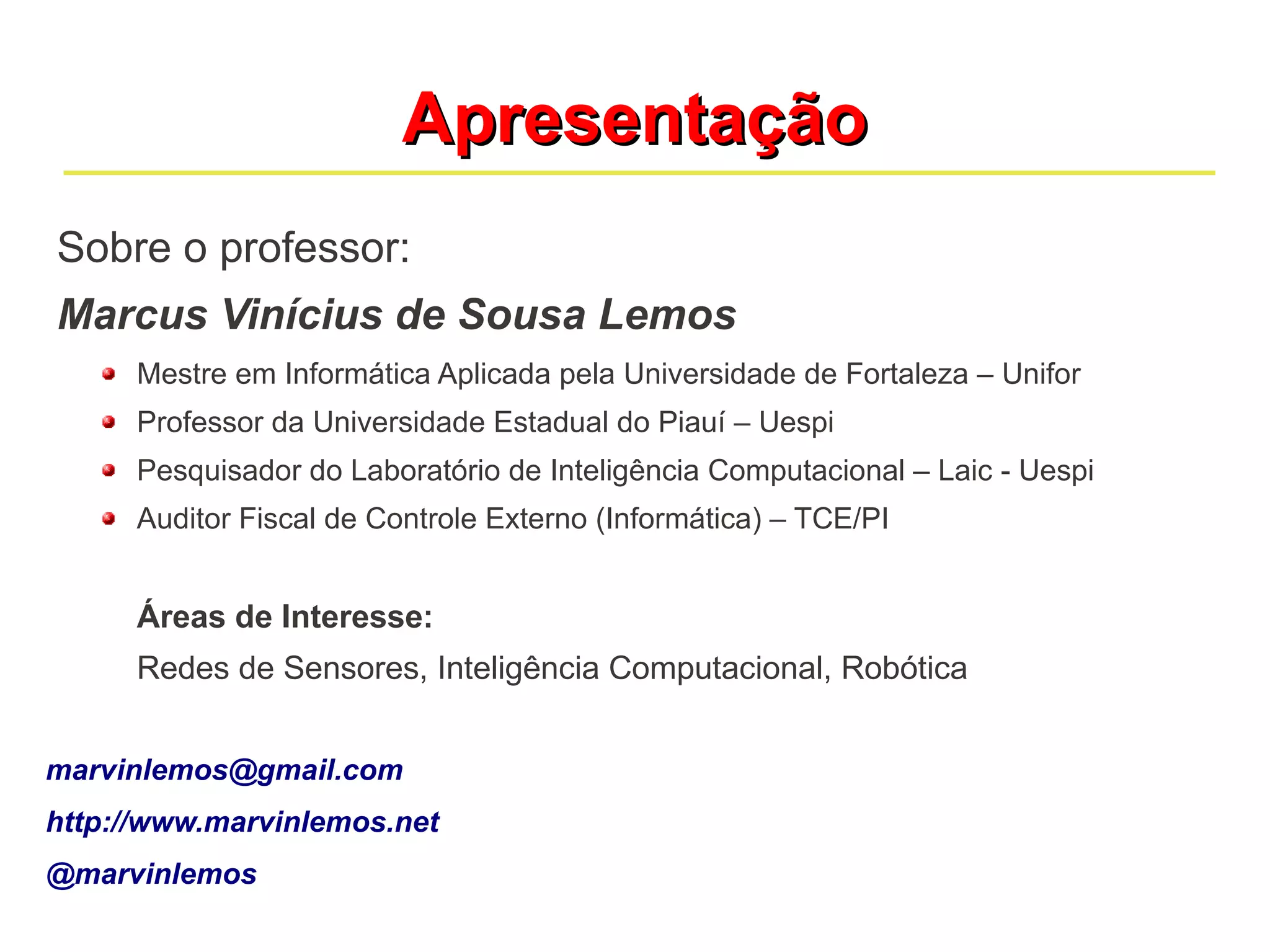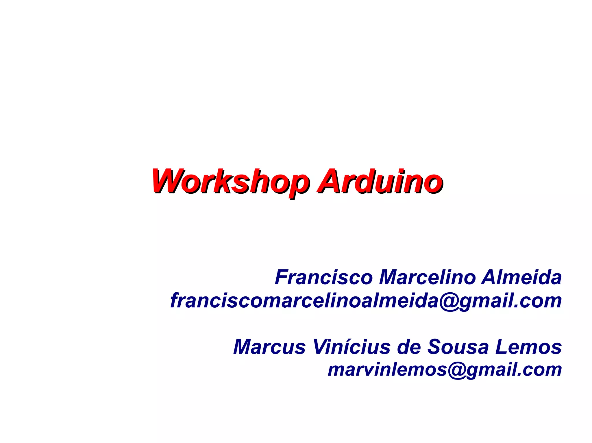 O documento apresenta dois professores: Marcus Vinícius de Sousa Lemos e Francisco Marcelino Almeida. Ambos são pesquisadores interessados em inteligência computacional e desenvolvimento com Arduino. O texto também fornece uma introdução sobre a plataforma Arduino, incluindo suas características, versões e aplicações possíveis.