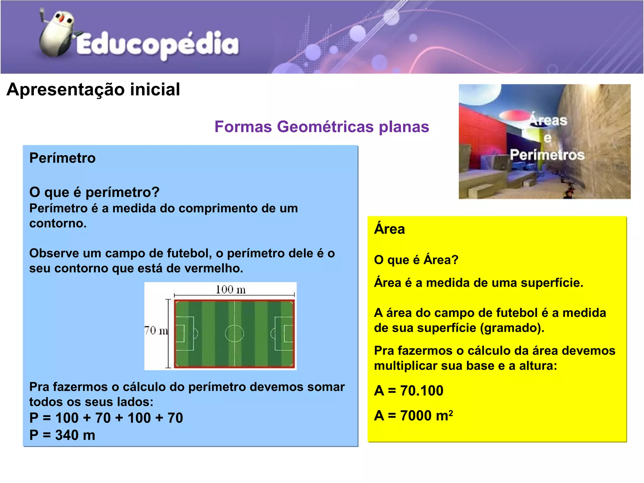 O documento discute conceitos de área e perímetro de figuras geométricas planas. Explica que área é a medida de uma superfície enquanto perímetro é a soma dos comprimentos dos lados de uma figura. Fornece exemplos como o cálculo da área e perímetro de um campo de futebol e realiza perguntas para avaliar a compreensão do leitor sobre esses conceitos.