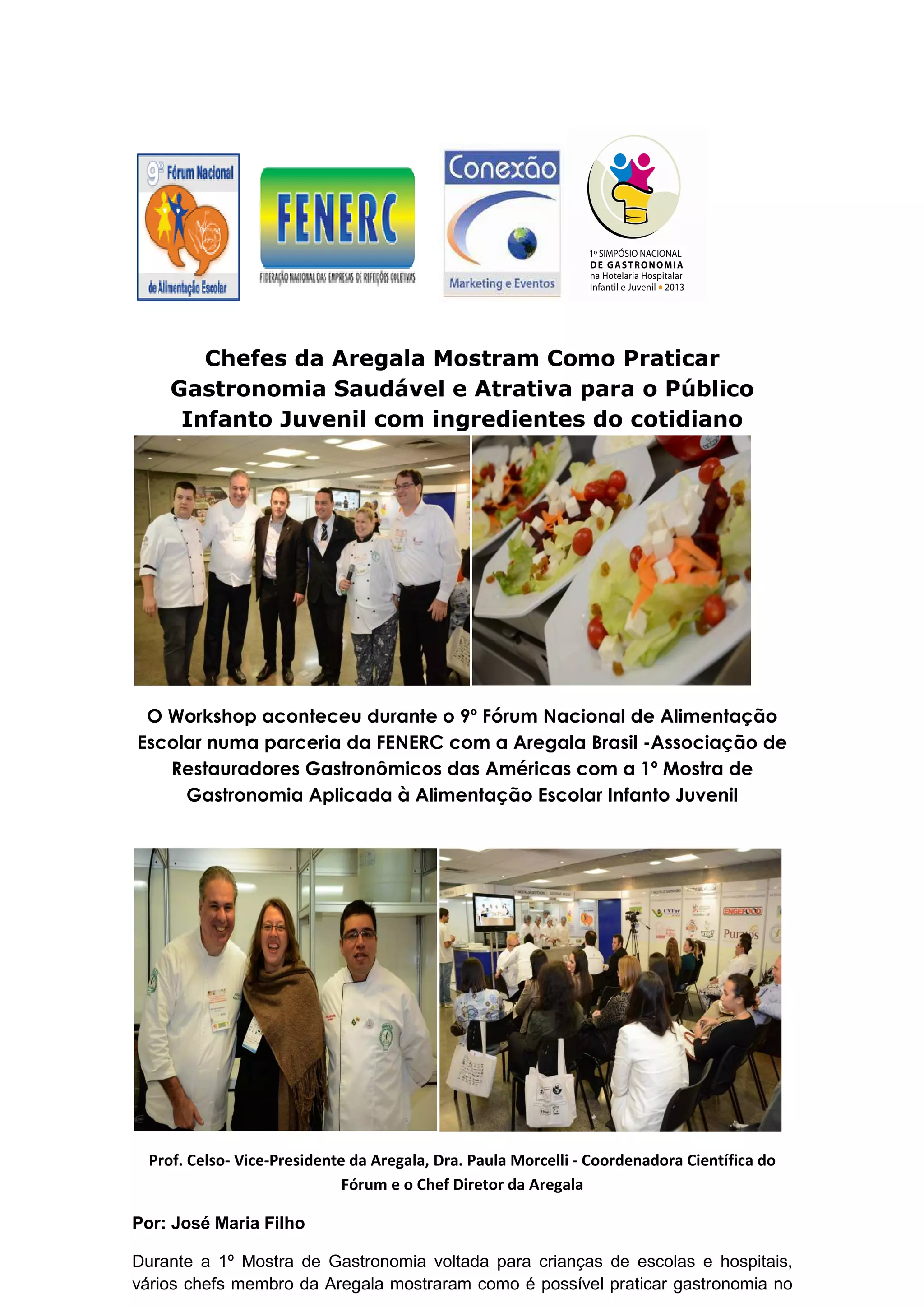 O documento descreve um workshop realizado durante o 9o Fórum Nacional de Alimentação Escolar que reuniu chefs da Aregala para mostrar como praticar gastronomia saudável e atraente para crianças e adolescentes utilizando ingredientes cotidianos. A apresentação incluiu receitas como o Mexidinho Saudável. O evento objetivou promover uma alimentação escolar e hospitalar infantil de qualidade.