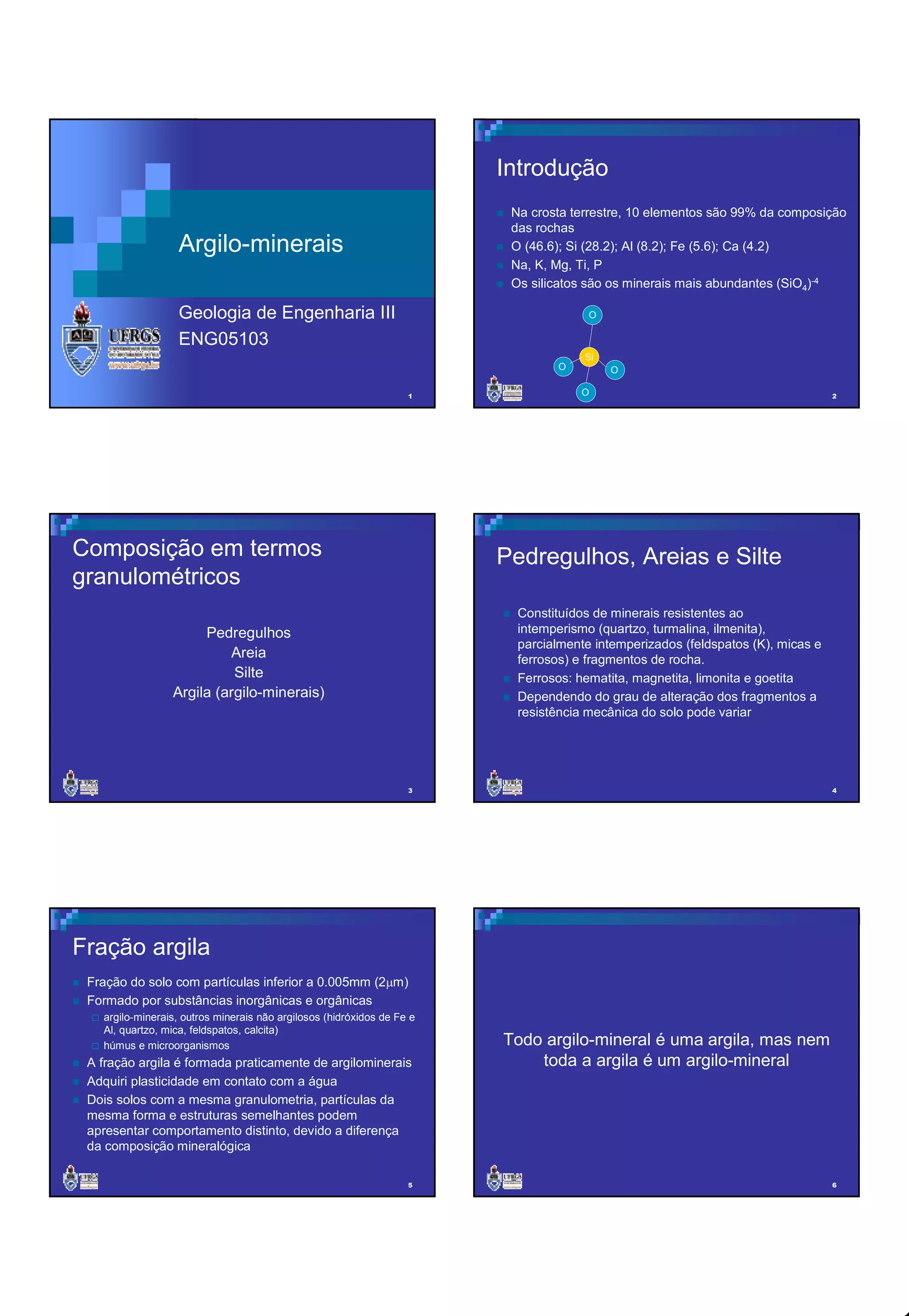 O documento discute os principais tipos de argilo-minerais, sua estrutura e propriedades. Descreve que os argilo-minerais mais comuns são caulinita, esmectitas e ilitas, que possuem estruturas de camadas e propriedades como plasticidade e troca iônica. Também explica como a presença de água intercalada entre as camadas das esmectitas afeta suas propriedades.