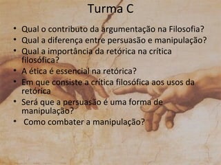 Este documento apresenta várias questões levantadas por diferentes turmas sobre a relação entre argumentação, filosofia, persuasão, manipulação e retórica. As turmas questionam a diferença entre persuasão e manipulação, o papel da ética na retórica, e como combater a manipulação.