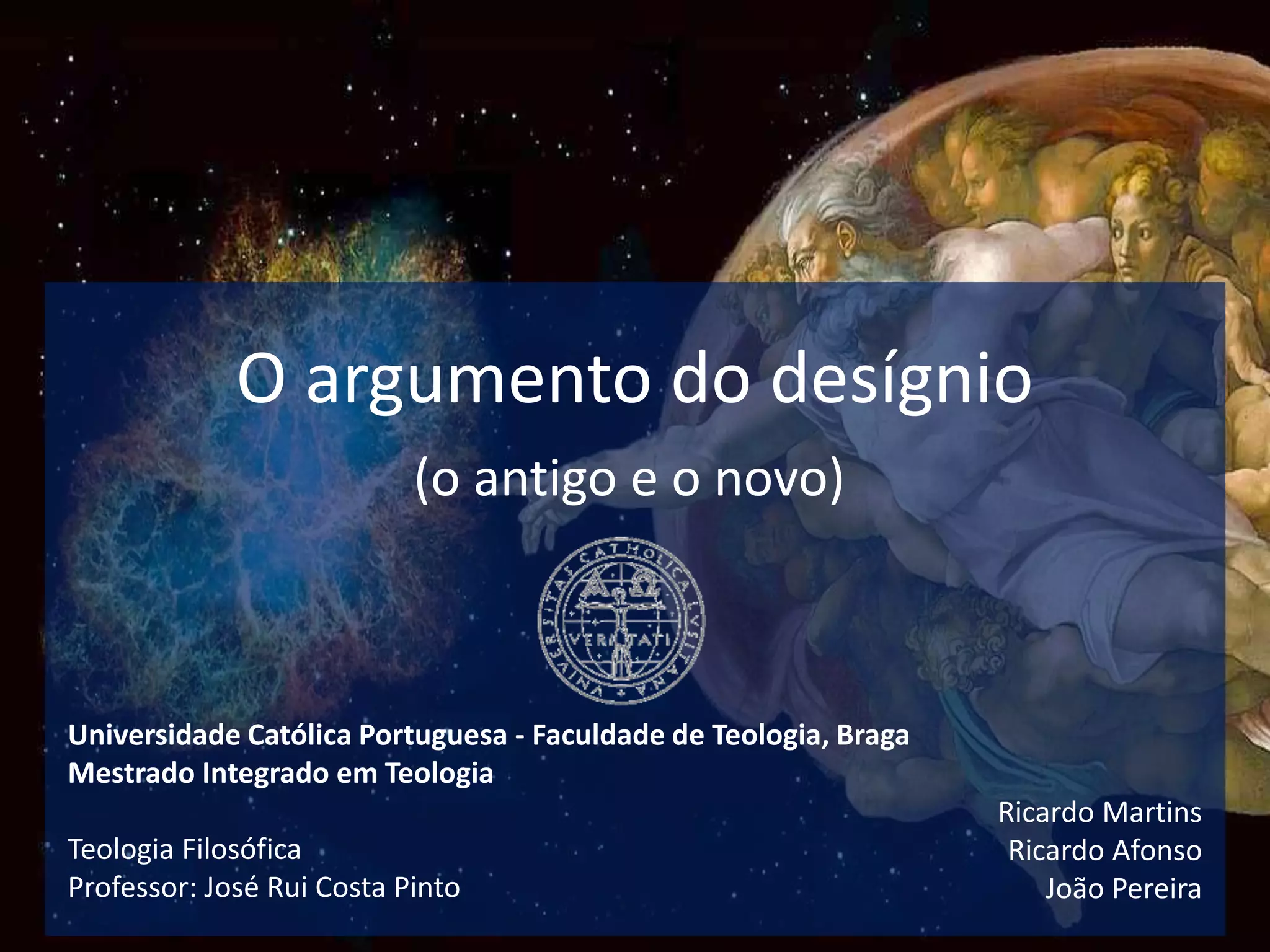 O documento discute o antigo e o novo argumento do design. No antigo argumento, afirmava-se que o universo se assemelha a uma máquina e, portanto, deve ter sido criado por um designer inteligente. Hume criticou esta visão, apontando que não podemos assumir que o universo como um todo é um sistema teleológico. O novo argumento do design parte das condições necessárias para a vida existir e argumenta que a probabilidade destas condições ocorrerem por acaso é extremamente baixa. No entanto, este argumento