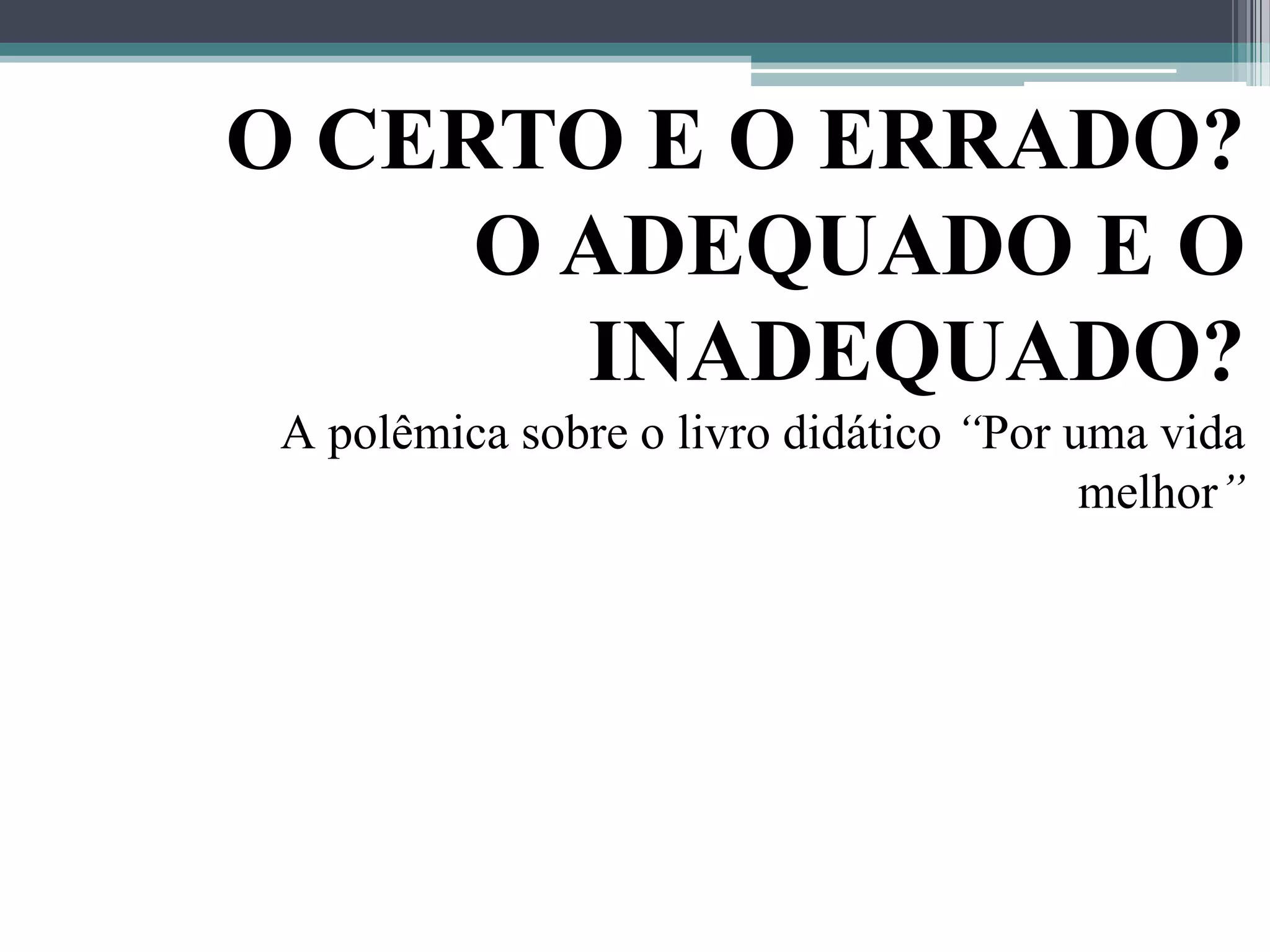 O livro didático "Por uma vida melhor" defende que expressões como "os livro" e "nós pega" devem ser aceitas na sala de aula ao invés de reprimidas, e que "correto" e "incorreto" devem ser substituídos por "adequado" e "inadequado" dependendo da situação. O livro foi produzido por especialistas e adotado por muitas escolas, porém também gerou polêmica sobre o ensino da norma culta.