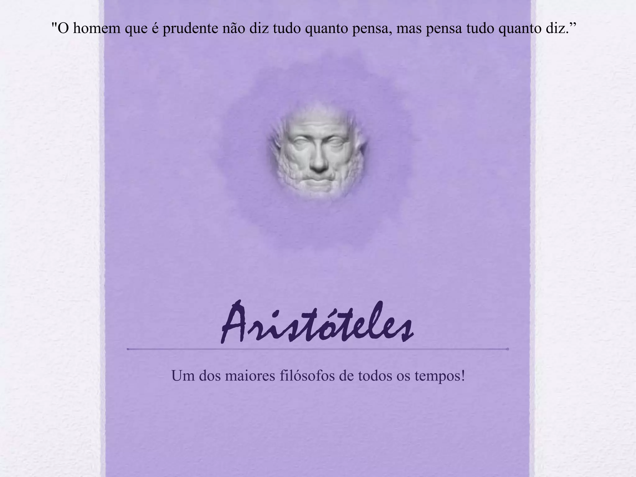 O documento resume a vida e obra do filósofo grego Aristóteles, desde seu nascimento em 384 a.C. até sua morte em 322 a.C. Detalha sua educação com Platão em Atenas, seu trabalho como professor de Alexandre, o Grande, e a fundação de sua escola Liceu. Resume suas principais áreas de estudo e obras, incluindo Ética, Política e Órganon, destacando sua influência na educação e pensamento ocidental.