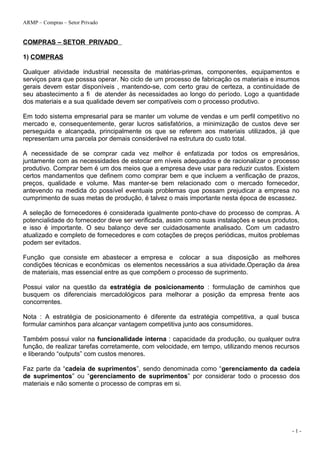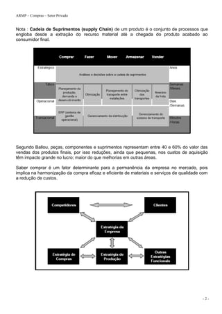 O documento discute a importância das compras para o setor privado, destacando que (1) a aquisição de matérias-primas, componentes e serviços é essencial para a operação das empresas e a redução de custos, (2) a seleção criteriosa de fornecedores é fundamental para evitar problemas de abastecimento, e (3) a função de compras faz parte da cadeia de suprimentos e influencia diretamente a competitividade e lucratividade das organizações.