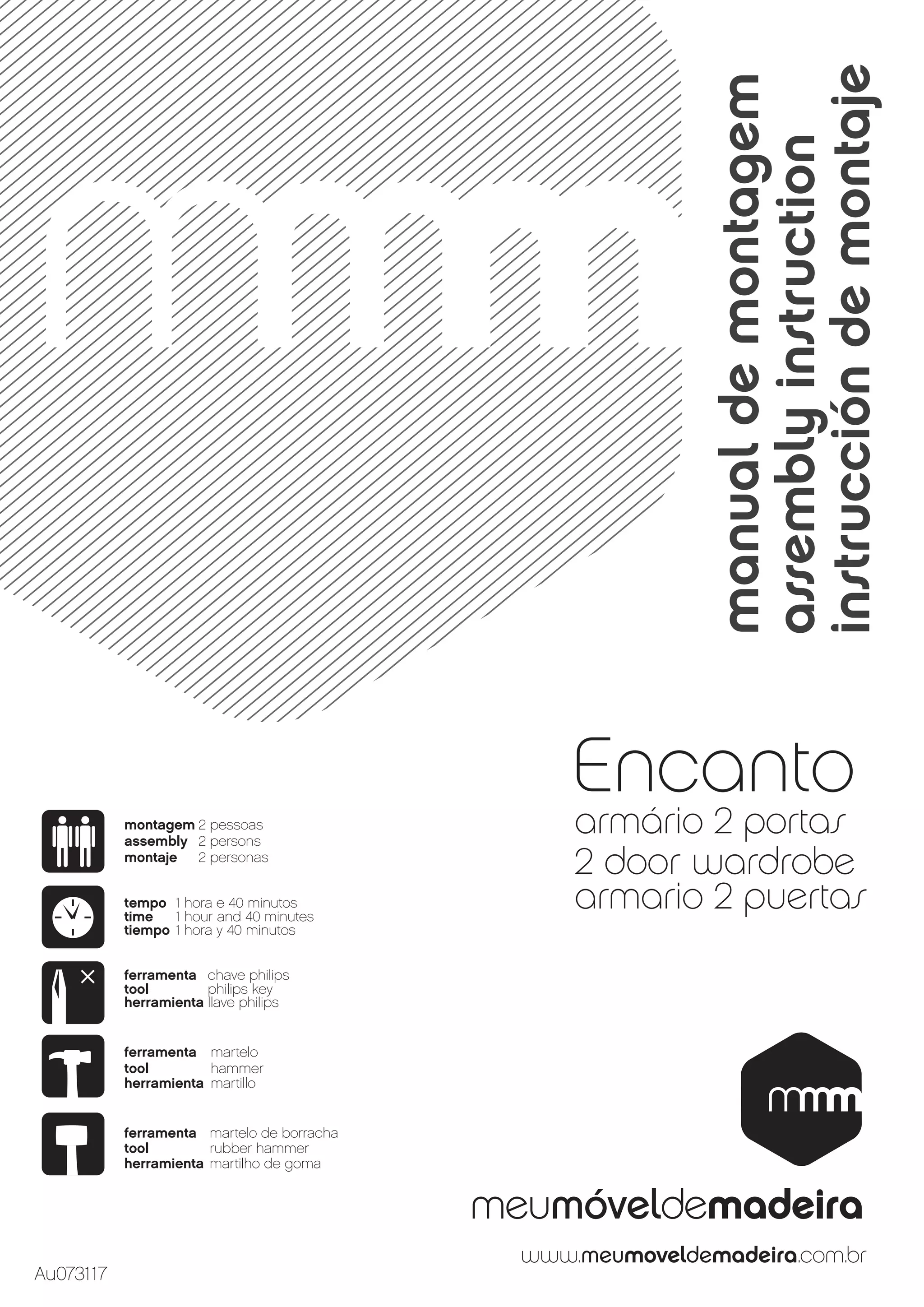 [1] Instruções para montar um armário de 2 portas em 1 hora e 40 minutos com 2 pessoas. [2] São fornecidas ferramentas como chave de fenda e martelo, além de peças numeradas. [3] Deve-se ler atentamente as instruções, montar em superfície limpa e apertar periodicamente os parafusos.