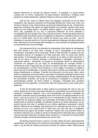 O documento discute a diferença entre aromaterapia e aromatologia, afirmando que a aromatologia é um ramo da aromaterapia que envolve o uso interno de óleos essenciais, ao contrário da crença comum de que só podem ser usados externamente. Apresenta estudos que mostram a eficácia do uso interno de óleos essenciais no tratamento de problemas digestivos e outros.