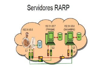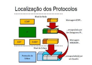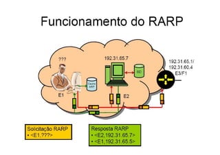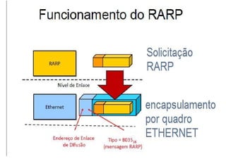 O documento descreve os protocolos ARP e RARP. O ARP mapeia endereços IP para endereços físicos de rede, permitindo que dispositivos na mesma rede localizem uns aos outros. O RARP funciona de forma semelhante, mas mapeia endereços físicos para endereços IP, permitindo que dispositivos sem disco rígido obtenham endereços IP. Ambos os protocolos operam apenas na camada de enlace de dados e são essenciais para a comunicação em redes Ethernet.