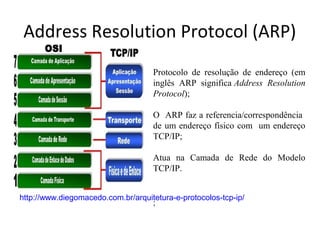 O documento explica os protocolos ARP e RARP, que funcionam na camada de rede do modelo TCP/IP. O ARP mapeia endereços físicos (MAC) para endereços lógicos (IP). Já o RARP permite que dispositivos determinem seus endereços IP a partir de tabelas de correspondência armazenadas em servidores.