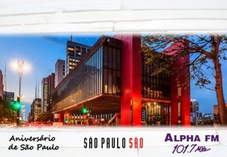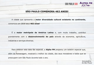 O documento celebra os 462 anos da cidade de São Paulo, a maior metrópole da América Latina. A emissora Alpha FM preparou um boletim especial para homenagear a data com conteúdos sobre a cidade, seus moradores e tudo que faz São Paulo ao longo do ano. O boletim será veiculado diariamente com apresentação de Lala Deheinzelin.