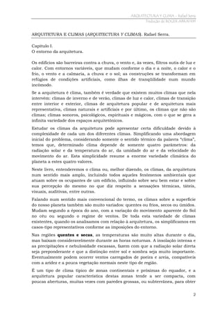 2) É apresentado um resumo dos principais tipos de clima e como a arquitetura é projetada para cada um, incluindo regiões quentes e secas, quentes e úmidas, frias, temperadas e ventosas.