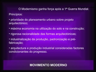 O documento discute o Movimento Moderno na arquitetura, destacando seus princípios fundamentais como prioridade do planejamento urbano, economia no uso do solo, racionalidade das formas, industrialização e produção como fatores do progresso. Também apresenta as principais linhas de pensamento do movimento e biografias de arquitetos pioneiros como Le Corbusier, Gropius e Mies van der Rohe.
