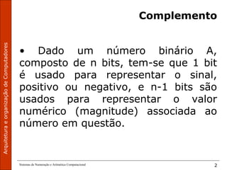 O documento discute sistemas de numeração e aritmética computacional, especificamente complemento de 1 e complemento de 2. Complemento de 1 é obtido pela negação de todos os bits de um número binário. Complemento de 2 representa números positivos diretamente e negativos como o complemento e mais um da representação binária invertida. Isso permite representar valores negativos de forma única usando a mesma regra de soma para positivos e negativos.