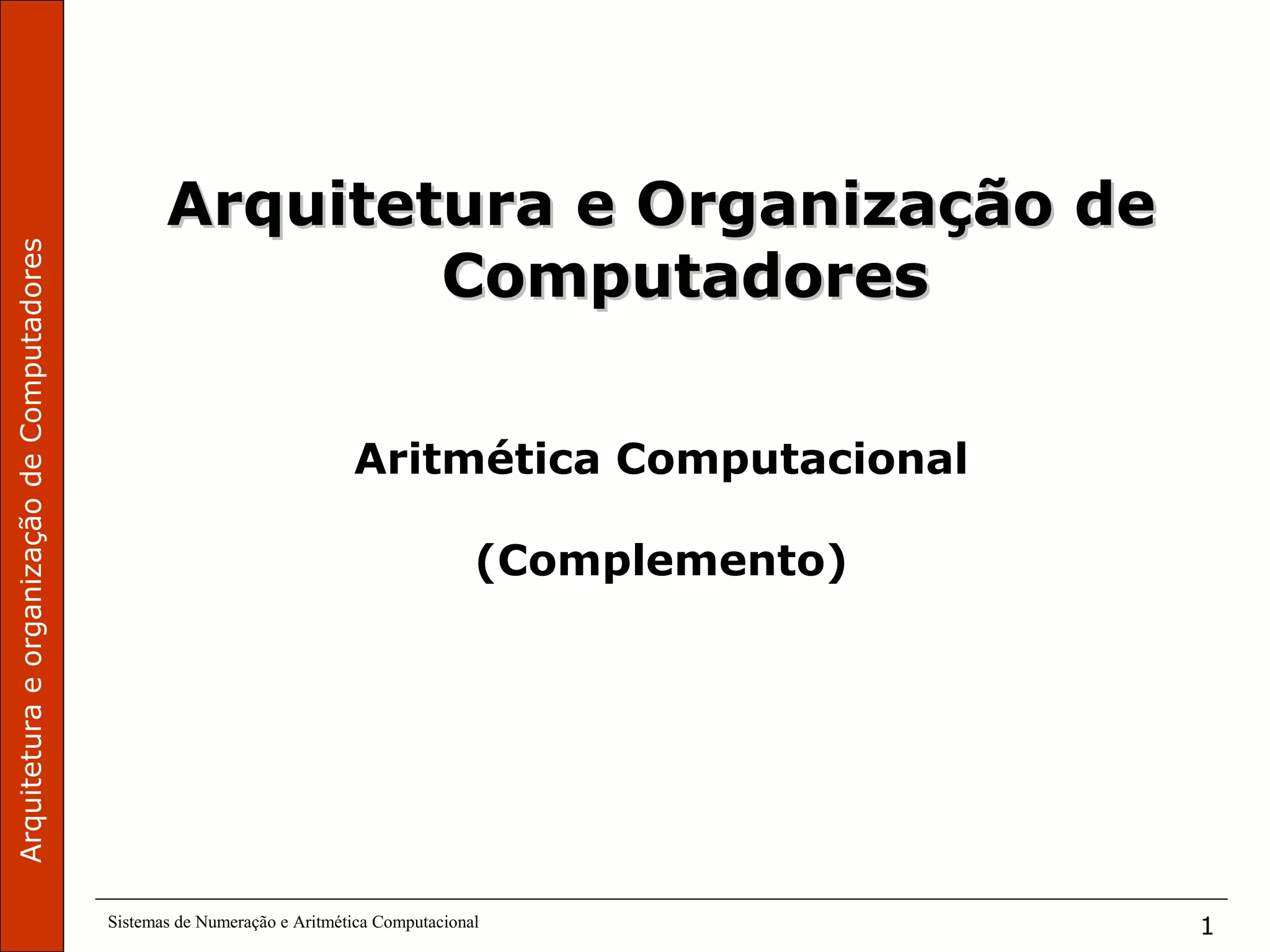 O documento discute sistemas de numeração e aritmética computacional, especificamente complemento de 1 e complemento de 2. Complemento de 1 é obtido pela negação de todos os bits de um número binário. Complemento de 2 representa números positivos diretamente e negativos como o complemento e mais um da representação binária invertida. Isso permite representar valores negativos de forma única usando a mesma regra de soma para positivos e negativos.