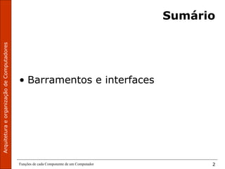 - O documento discute os componentes de um computador e seus barramentos, incluindo definições de barramento, tipos de barramento, exemplos de barramentos comerciais como ISA, EISA, PCI e PCIe.