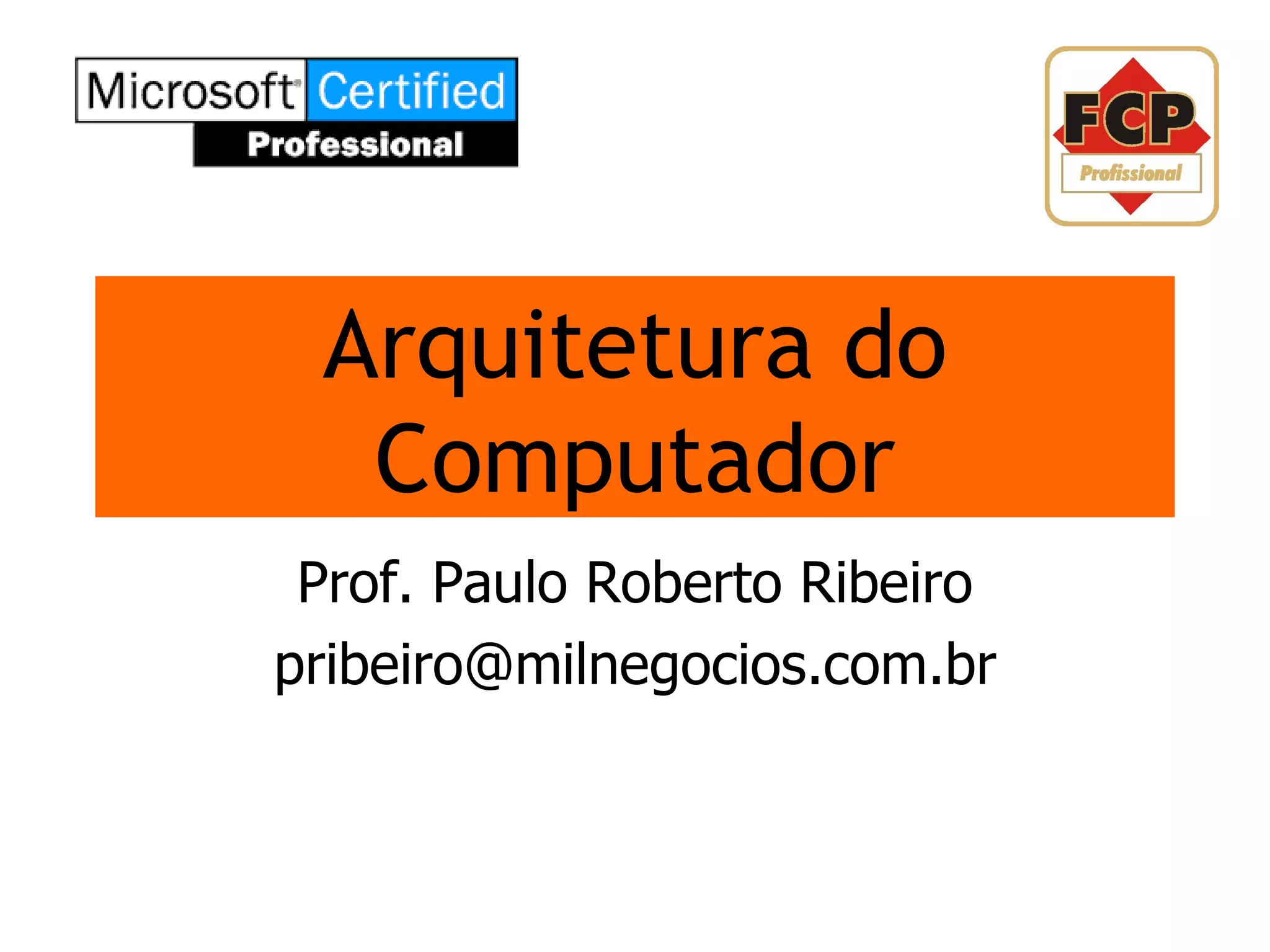 O documento resume os principais conceitos sobre a arquitetura de computadores. Em particular, descreve (1) o que é um computador e suas principais partes, (2) como os computadores são classificados de acordo com sua operação, utilização e usuário, e (3) os componentes básicos que compõem a arquitetura de um computador, incluindo a unidade central de processamento e memória.