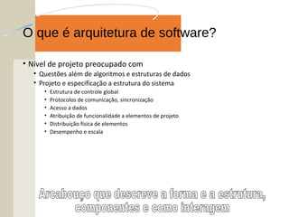 Arquitetura de software é o nível de projeto que especifica a estrutura global de um sistema, incluindo subsistemas, camadas e elementos essenciais. O documento discute como produzir uma arquitetura de software inicial, incluindo análise de casos de uso, definição de organização de subsistemas e identificação de abstrações principais.