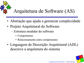 O documento discute a arquitetura de software como uma abstração que ajuda a gerenciar a complexidade de sistemas de software, representando sua estrutura modular através de componentes e relacionamentos entre eles. A arquitetura serve como uma ponte entre os requisitos do sistema e sua implementação.
