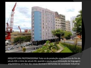1) A arquitetura protomoderna surgiu no fim do século XIX e início do XX em resposta às novas demandas da sociedade industrial.
