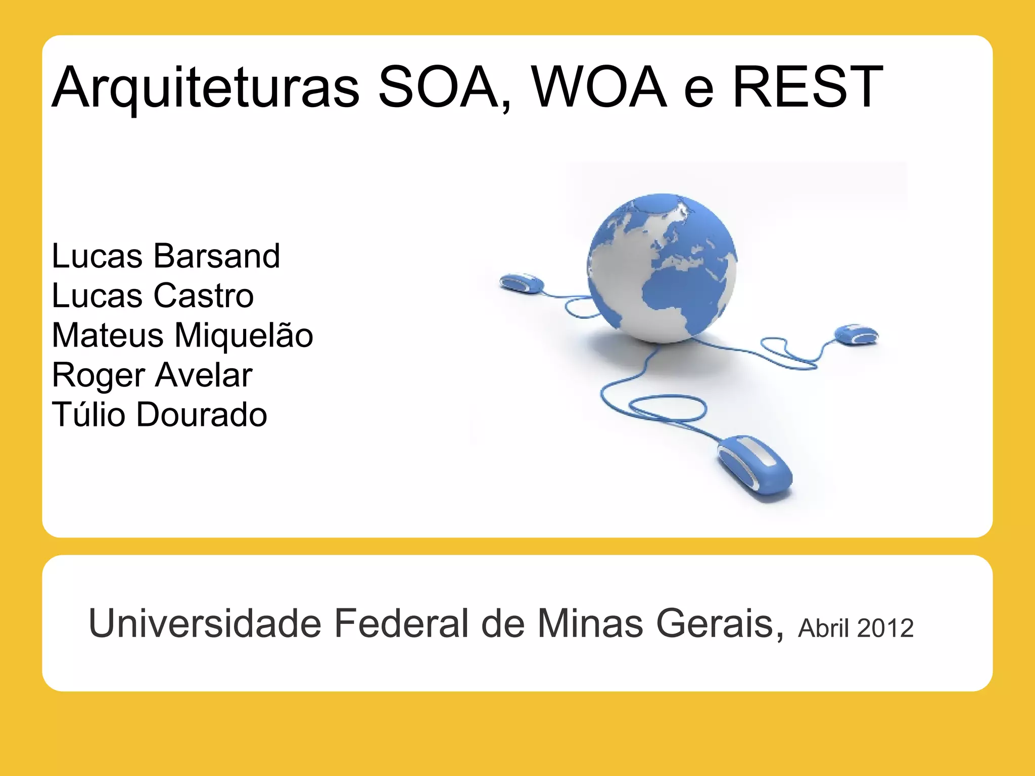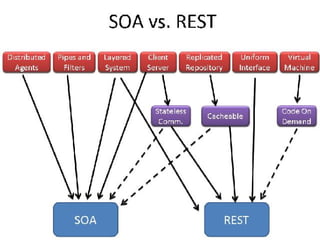 Este documento discute arquiteturas de software como SOA, WOA e REST. SOA visa aumentar a produtividade e diminuir custos através da centralização de informações compartilhadas entre sistemas internos e externos. REST usa protocolos como HTTP para permitir a troca segura de informações entre usuários e servidores, onde cada recurso é acessado via URI. WOA estende SOA para aplicações web, facilitando mudanças rápidas e pesquisa.