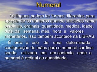 O documento discute como os números são representados em LIBRAS, incluindo cardinais, ordinais e quantidades. É incorreto usar a mesma configuração de mãos para cardinais em contextos de ordinais ou quantidades. Cardinais são usados para códigos como números de telefone. Ordinais são sinalizados com movimento.